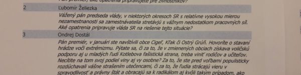 Chcel som od premiéra odpoveď na otázku, či necíti svoj podiel viny na raste podpory pre radikálov na Slovensku, keďže sám šíri medzi ľuďmi nenávisť a strach. Otázka znela: „Pán premiér, v januári ste navštívili obce Cigeľ, Kľak či Ostrý Grúň. Hovoríte o stavaní hrádze voči extrémizmu. Pýtate sa, či za to, že v zmienených … Čítať ďalej Ako Fico neprišiel a Pellegrini za neho neodpovedal